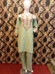 Crafted from Summer Slub (Feels like Marina) in pastel green, this elegant outfit features a front-open embroidered shirt with lace detailing at the hem. The sleeves have embroidered borders, lace finishing, and an embellished button.